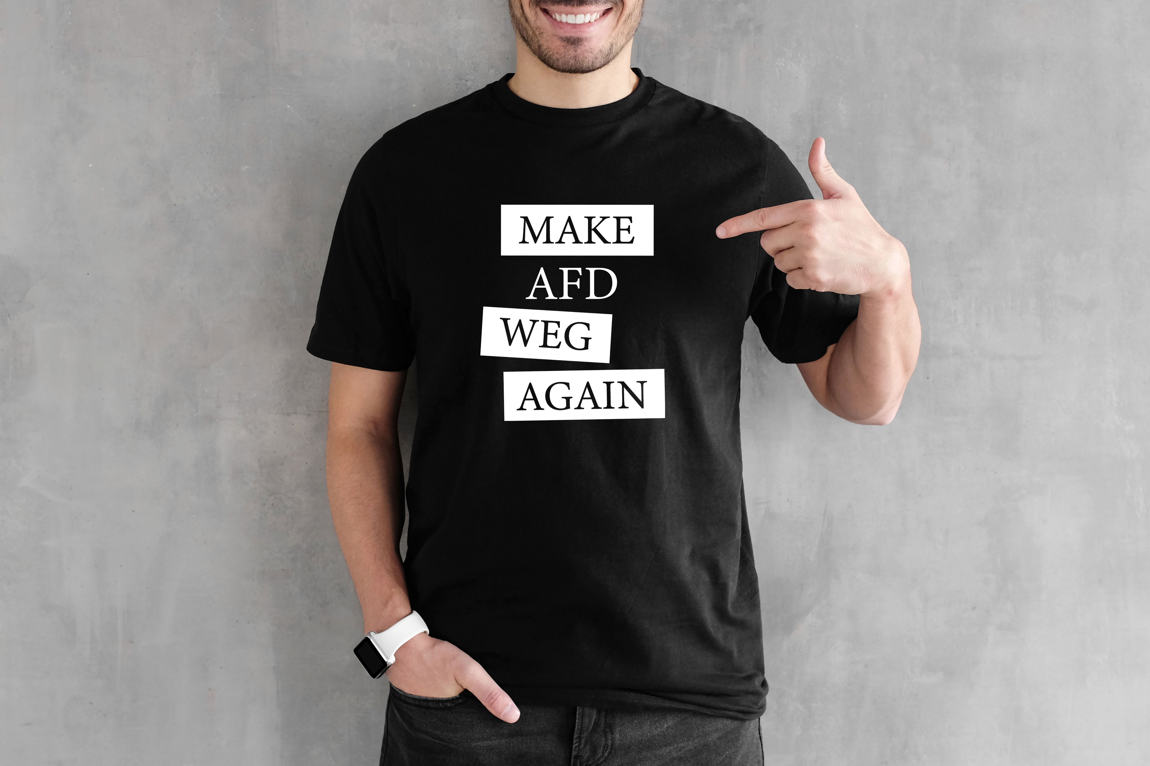 Antifaschistisches Schmuckshirt mit der Aufschrift “MAKE AFD WEG AGAIN”.